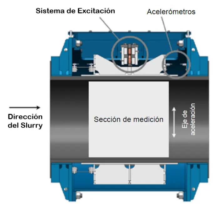 Acelerómetros de alta velocidad permiten una respuesta inmediata. La señal 4–20 mA representa la densidad real del flujo total. Con caudal opcional, permite medir flujo de masa.