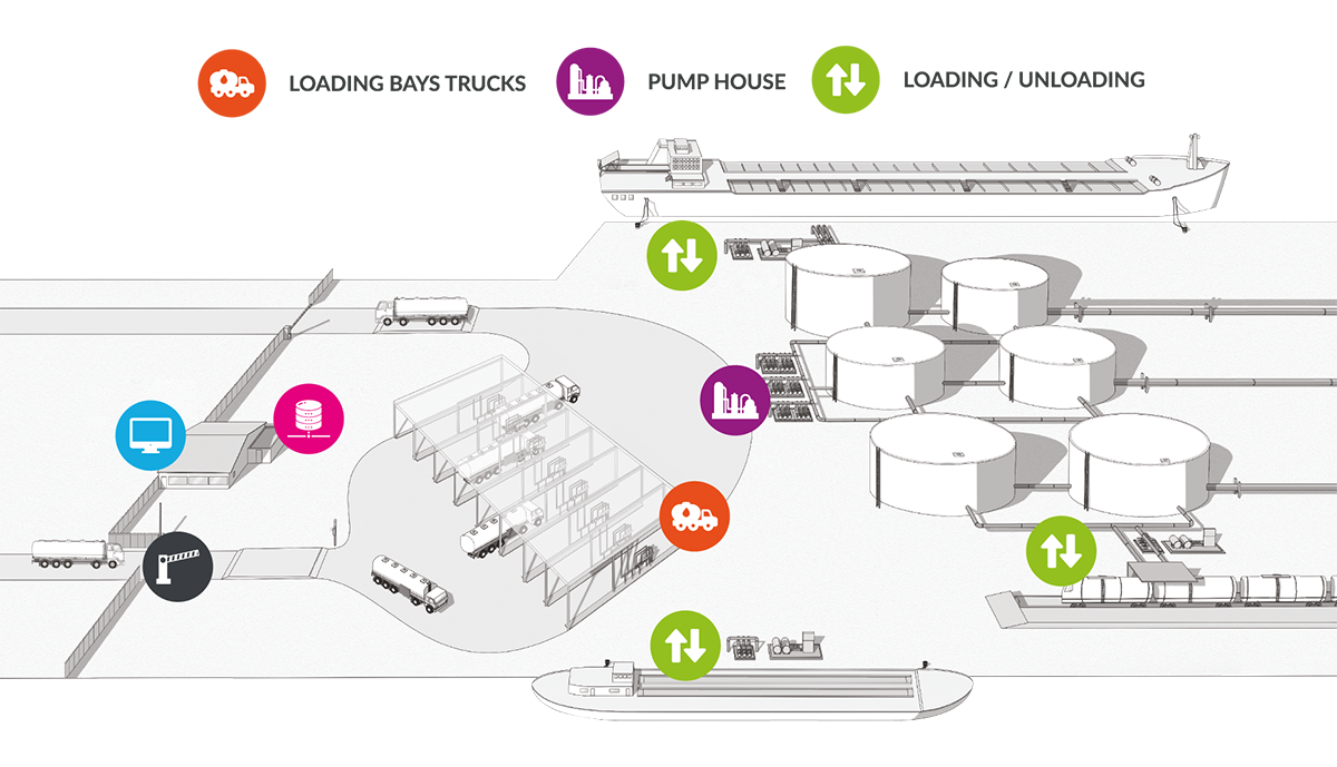 Desde los muelles de carga, que son el núcleo central de cada terminal petrolera, las soluciones SAMPI se encargan de integrar y gestionar todas las fases necesarias para llevar a cabo el proceso de descarga inicial y posterior salida del camión una vez repostado.